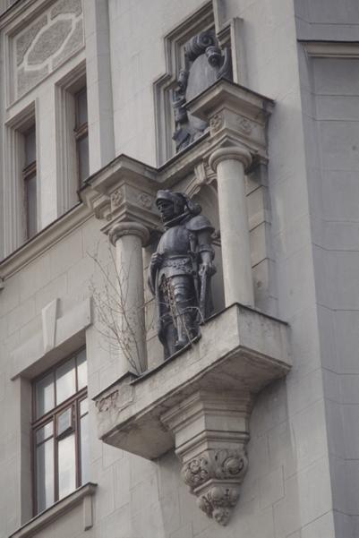 Проектом «Дома с рыцарями» занимался архитектор Валентин Дубовский. Он решил построить здание в неоготическом стиле, украсить его витражами и скульптурами. Поставить на стены рыцарей — его идея. Двух стражей было видно издалека. Одно время семиэтажный жилой дом был не только самым высоким на Арбате, но и вообще одним из главных столичных небоскребов.