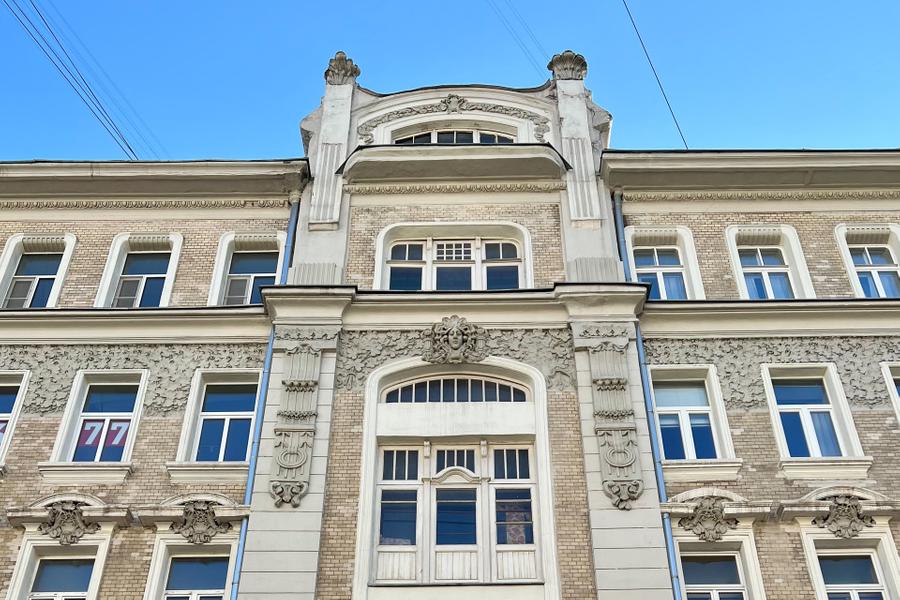 «Дом имеет много признаков модерна, — объясняет Ирина Буреева. — Это и фасадная отделка в виде плитки "кабанчик" приятного бежевого оттенка, и рельефный фриз с изображением листьев каштана. Здесь симпатичные декоративные кронштейны, много лепнины, выполненной в растительных мотивах. Обращают на себя внимание маскароны — красивые женские лики, которые еще называют лорелеями. Мансардные окна оформлены красивой гирляндой из завитков лент и цветов. Частично сохранились оригинальные решетки балконов. Их рисунок изображает сплетенные тонкие ветви и очень напоминает дизайн решеток первых станций метрополитена в Париже. В доме было 14 квартир, и шесть из них занимали сами Толстые, а остальные сдавались жильцам. Нижний этаж был отведен под магазины — это было стандартным решением для доходных домов в ту эпоху. Черный ход вел за дом, где находился сад, который был хорошо спроектирован и обустроен. В нем был даже фонтан с бассейном, и на лето в него пускали золотых рыбок, которых очень любила хозяйка дома».