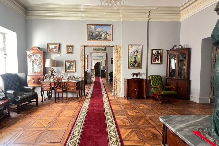 «Здание сейчас используется как резиденция, — объясняет Евгений Борисович. — Здесь выставляются современные художники, продаются работы Дарьи Смирновой и Артура Мирзояна. Какие-то картины принадлежат мне, какие-то друзьям. А обставили мы тут все французской мебелью XIX века.