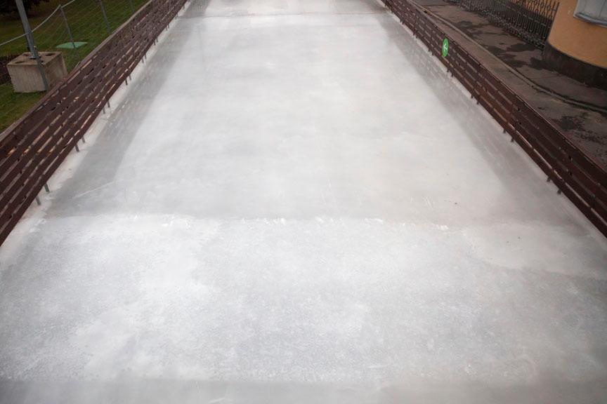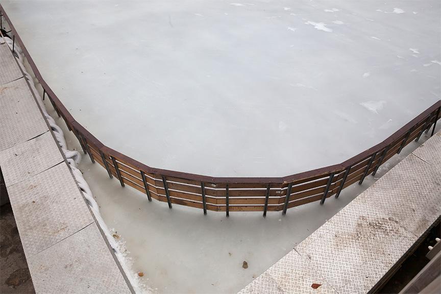 Сразу после намораживания мы получаем неровный мутный лед, который не очень подходит для катания. Поэтому дальше в ход идет льдозаливочная техника — машины со специальным ножом для подрезки льда. То, что мы подрезали, собирается внутрь машины. И завершающий штрих: машина заливает лед горячей водой (около 80 градусов). Эта вода уже доплавляет лед и делает его зеркальным. Вот теперь мы готовы принимать гостей.