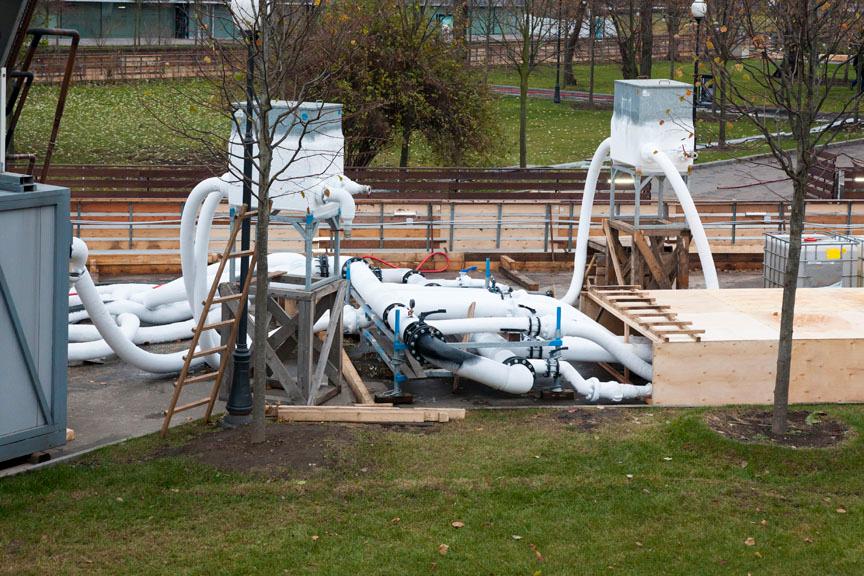 На первом этапе каток — это большой конструктор «лего», порядка 200 машин оборудования. В части, которая касается меня, это холодильные установки и очень много труб, в остальном — это мост, павильоны проката, различные подиумы и ограждения. Каток в Парке Горького состоит из пяти-шести зон, каждая из которых холодится отдельными станциями, поэтому то единое ледяное пространство, которое вы сегодня видите, это по сути пять отдельных участков, соединенных между собой и замороженных по очереди. Процесс идет частями, поскольку на заморозку всего катка единовременно просто не хватит воды. Суммарно процесс заморозки занимает около 45 суток. В нем традиционно задействовано больше 300 человек.