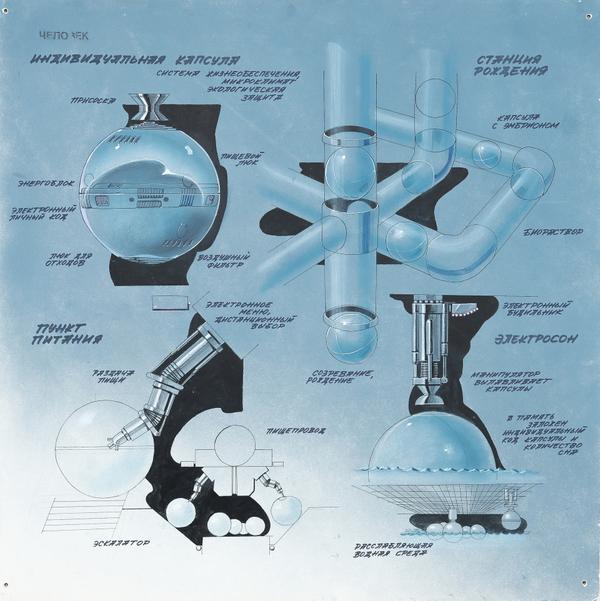В годы перестройки во ВНИИ Технической эстетики (ВНИИТЭ) разрабатывались сценарии утопий и антиутопий. В представленном прогностическом концепте человек рождается и умирает в индивидуальной капсуле, в которой проводит всю жизнь. Он защищен от болезней и плохой экологии, питается синтетической пищей, учится дистанционно, работает автономно, никогда не встречается со своим партнером и размножается, отсылая свой биоматериал.