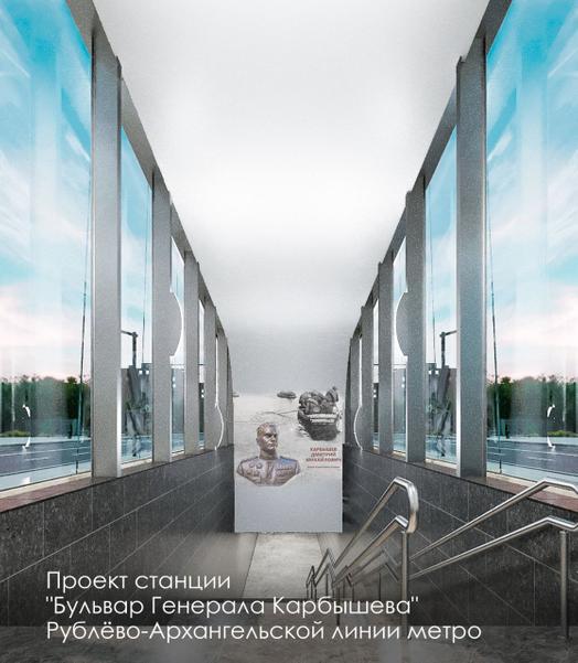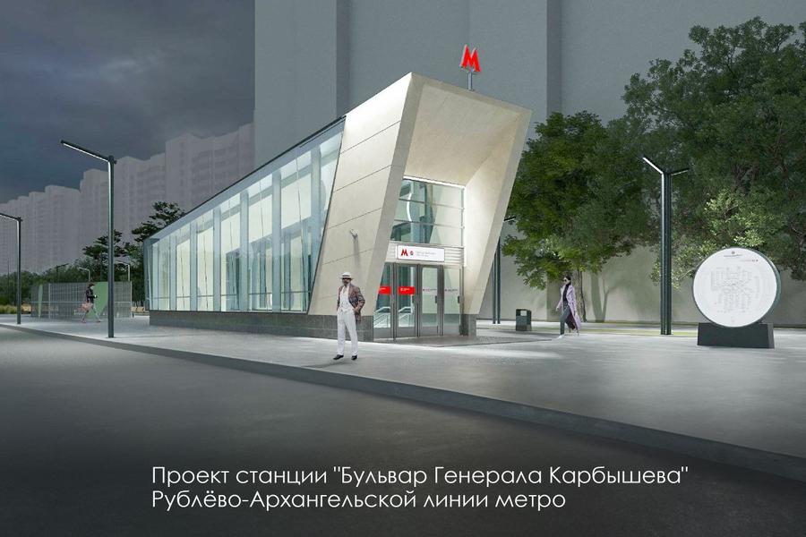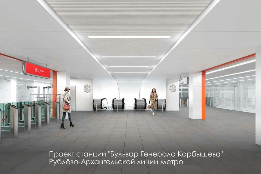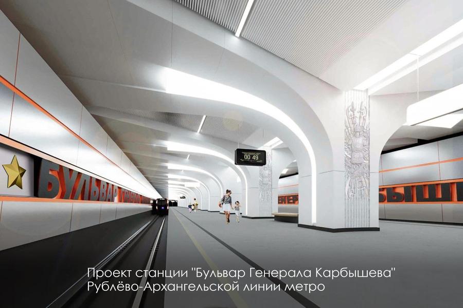 «Бульвар Генерала Карбышева» станет новой станцией Рублево-Архангельской линии. Пока станция готова лишь на 43 процента, но уже сейчас мэр показал ее архитектурную концепцию.
