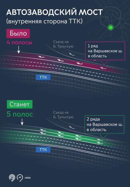 Еще один проект на Третьем кольце будет реализован на Автозаводском мосту. За счет переразметки на внутренней стороне добавится пятая полоса, что позволит расшить узкое место на ТТК, повысив пропускную способность моста на 20 процентов и прикрыв островком полосу выезда из-под моста.