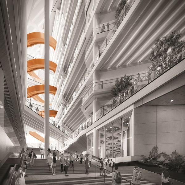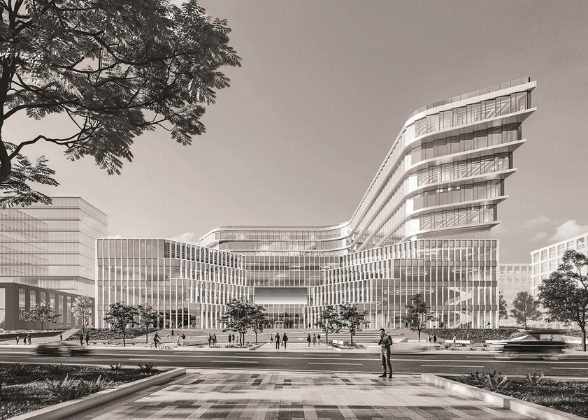 Национальный космический центр станет доминантой комплекса — символом достижений как в сфере науки, так и в плане архитектуры. Штаб-квартира с Центром управления полетами будет представлять собой треугольную башню высотой около 215 метров.