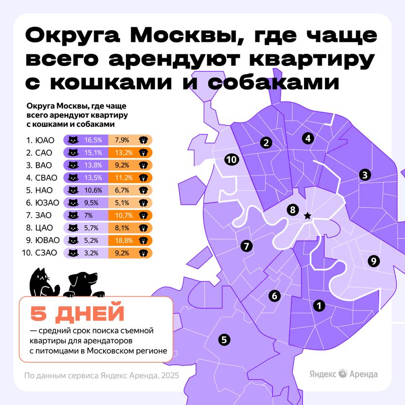 \Новое исследование Яндекс Аренды (есть в распоряжении редакции) показало, в каких округах Москвы арендаторы с домашними животными чаще всего снимают квартиры, где живет больше всего «кошатников» и «собачников» и какие необычные питомцы обитают в московских квартирах.