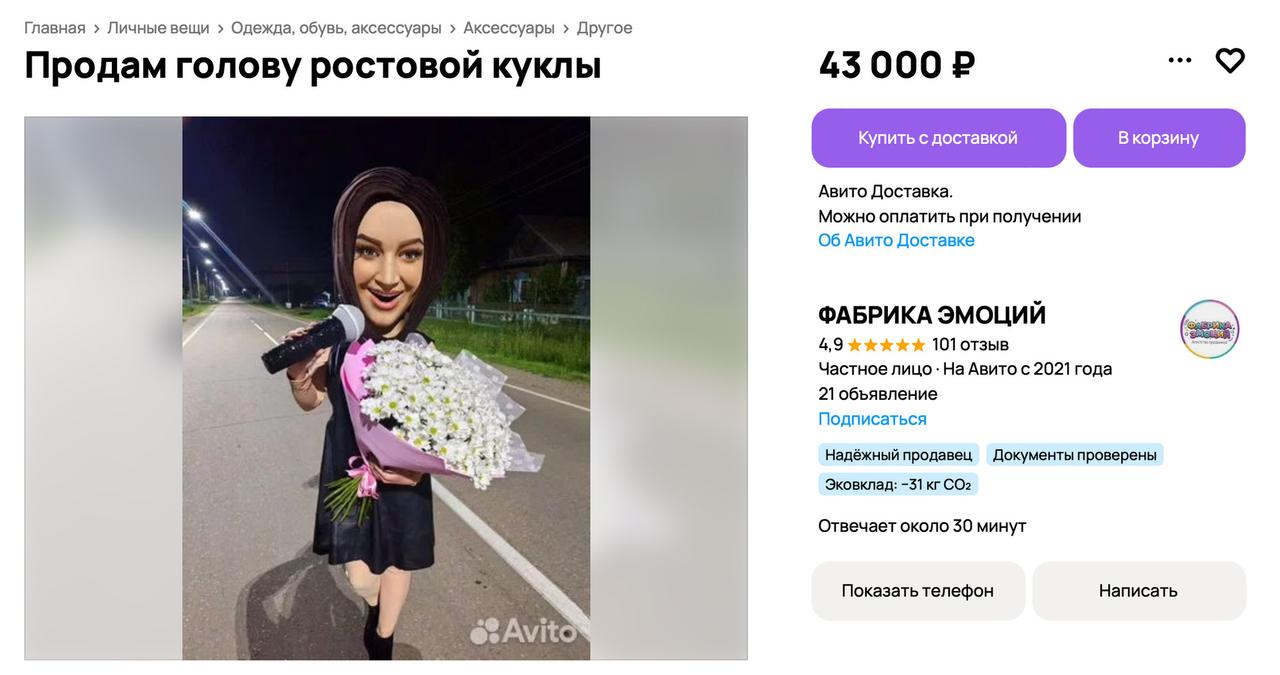 На Авито продают головы Бузовой. Страшную и непохожую — за 16500 рублей, и качественную, красивую за 43 000. Была еще одна, более напоминающая оригинал, за 35000 рублей, но ее быстро купили после того, как о ней написал Telegram-канал «Светский хроник».