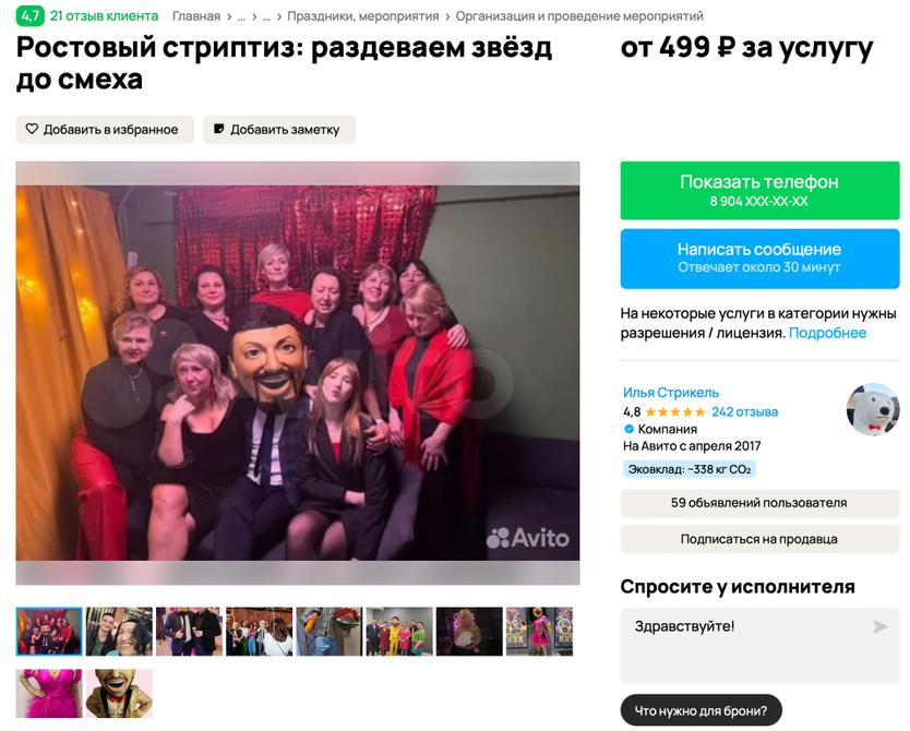 Если пройти по этим объявлением дальше, становится понятно, зачем эти головы нужны. Модным стал формат вечеринок «со звездой», когда наряженный в кого угодно аниматор приходит в офис, кафе или квартиру и по запросу заказчика проводит приличное или неприличное мероприятие. Среди выполненных заказов продавца головы Реввы — «Стриптиз с кумирами: почувствуй себя звездой в Ивантеевке», «Звездный беспредел - стриптиз без тормозов в Королеве», «18+ шоу: звезды раскрывают свои секреты в Щелково» и «Угарный стрип: звезды зажигают по-взрослому в Деденево» (все от 499 рублей). В отзывах пишут: «Очень хороший мужик, все организовал. Очень понравилось».