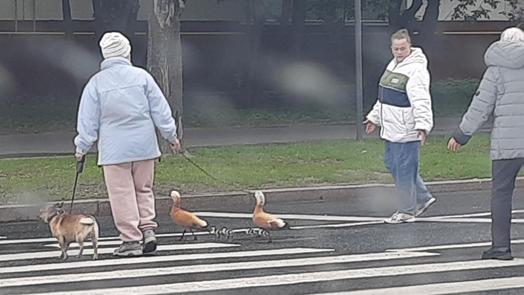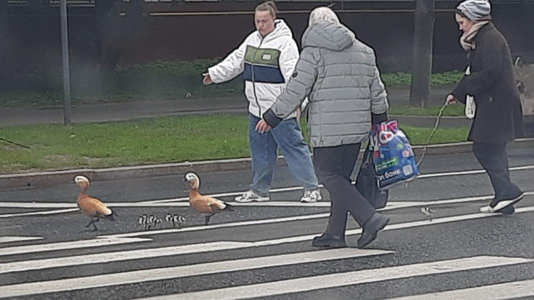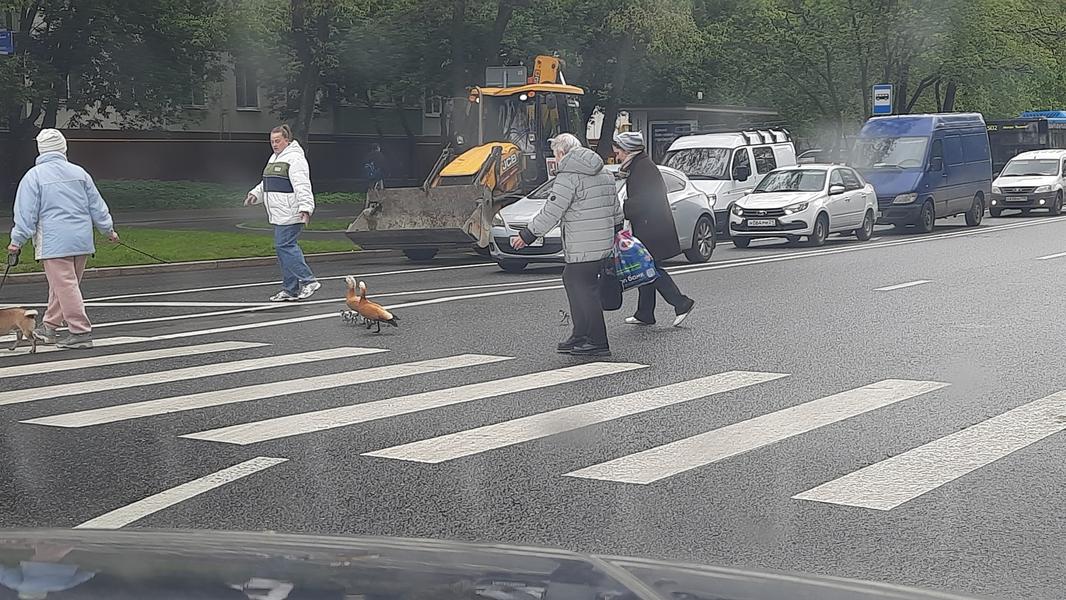 Пара огарей с выводком утят, как дисциплинированные горожане, переходили проезжую часть по пешеходному переходу. Несколько москвичей, ставшие свидетелями ситуации, решили им помочь.