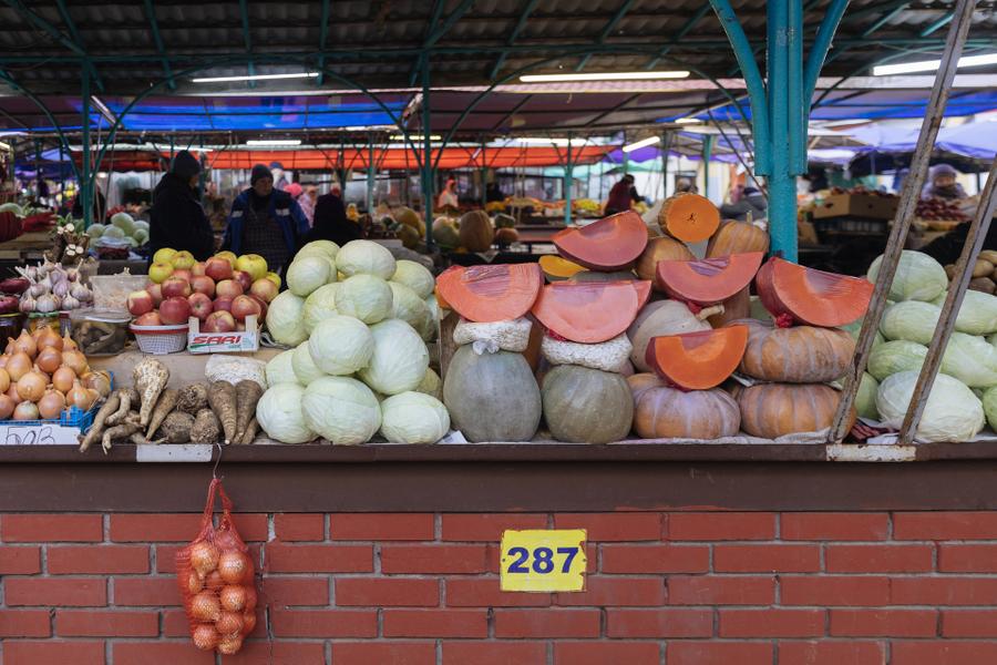 Площадь рынка в 29 тысяч квадратных метров вместила в себя все, что только возможно: овощи и фрукты, мясо, рыбу и мед. Здесь есть маленькие магазинчики, открытые торговые ряды, есть рыбная и грибная части. Тут же, по дороге на кладбище и на рынок, продаются ковры с изображением Владимира Владимировича Путина. А возле рядов с овощами и фруктами работает вещевой рынок.