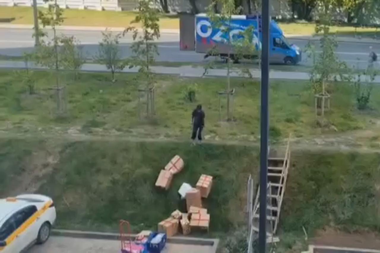 В Москве курьер решил, что с коробками, в которых лежали товары, купленные заказчиками за Ozon, можно не церемониться. Оставив машину на обочине дороги, он начал скидывать груз на дублер, расположенный ниже уровнем. Вещи пролетали значительное расстоянии, прежде чем приземлиться.