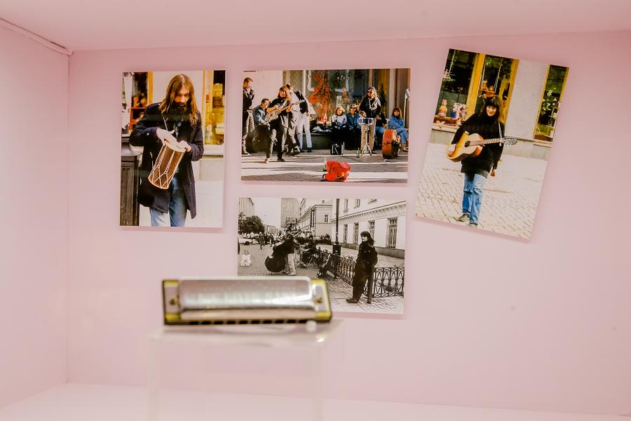 Витрина Анны Герасимовой (Умки) и Владимира Кожекина. В кадре: фотографии 1990-х и губная гармошка Владимира