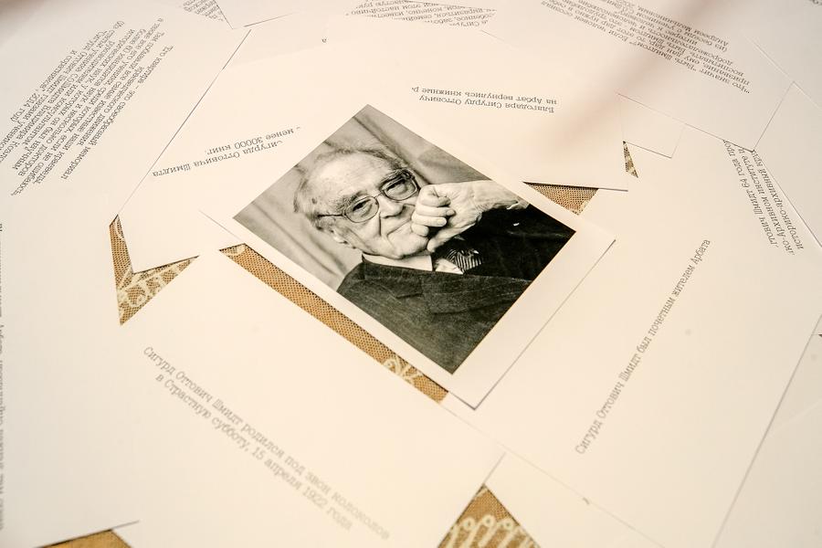 На выставке мы представили две работы учеников этой школы. «Арбатскую азбуку» Вани Лозинского — в бесконечных изгибах переулков он увидел буквы. А вторая работа исследовательская — памятник собирателю Арбатского архива Сигурду Шмидту. Он появился на свет в 1922 году в квартире в Кривоарбатском переулке, и удивительно, но через 91 год в ней же умер. После смерти Шмидта его ученик и помощник Андрей Мельников въехал со своей семьей в эту квартиру, которая досталась ему по завещанию. Так что в Кривоарбатском переулке это третий Мельников после архитектора Константина и его сына Василия.