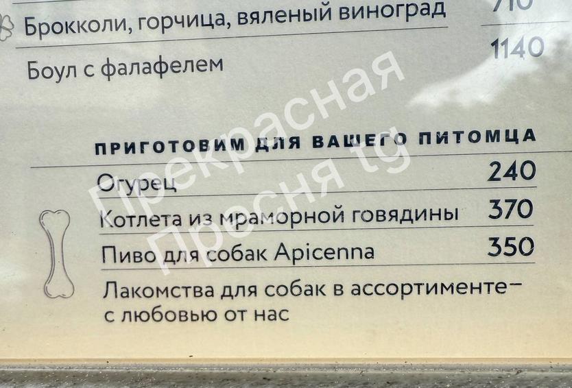 Питомцам предлагаю приготовить: котлету из мраморной говядины за 370 рублей, огурец за 240, подать специальное пиво для собак за 350. В общем, если хозяин раскошелиться на тысячу, его животное может неплохо «заморить червячка»… Впрочем, если говорить об отсыле к роману «Мастер и Маргарита», легко перекинуть мостик на его автора Михаила Булгакова, а от него — к знаменитому роману «Собачье сердце». Кто читал, поймет: от собачьего пива сердце Шарикова забилось бы в восторге.