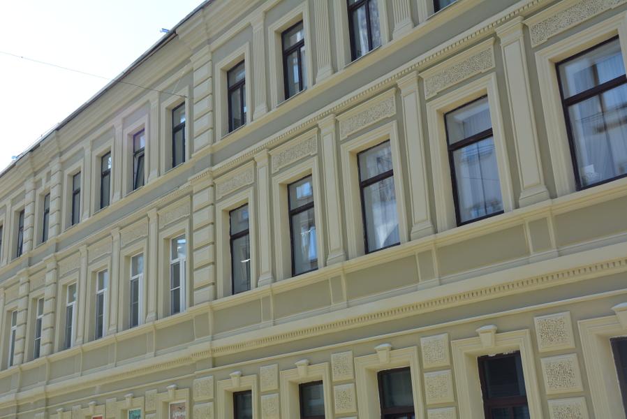 Это классический доходный дом с интересным декором фасада. На втором этаже есть скульптурные украшения, рельефный карниз, на последнем этаже — интересные балконы, вход оформлен аркой. На фронтоне — скульптуры и цифры, обозначающие дату постройки.