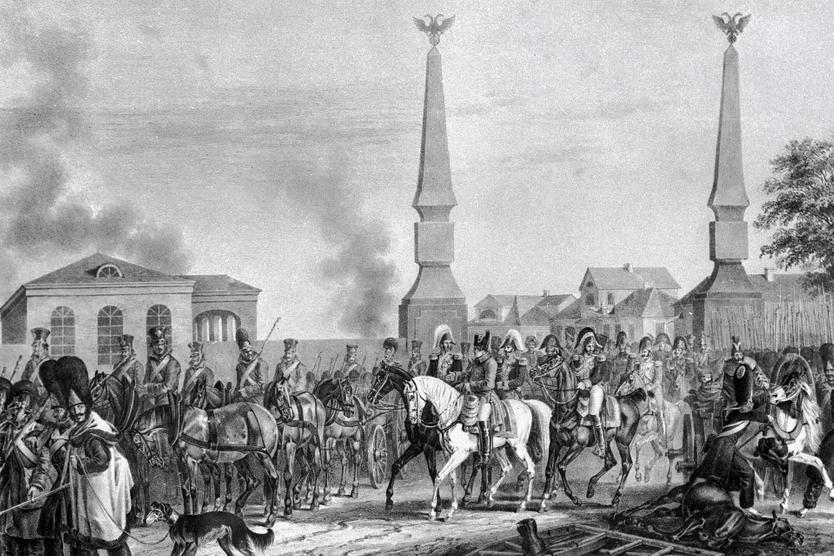 Репродукция гравюры Фабера дю Фора «Выезд Наполеона из Москвы через Калужскую заставу 7 октября 1812 года», из коллекции ГМИ