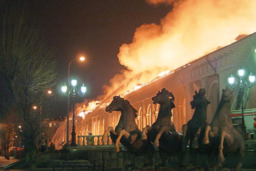 В марте 2004 года запылал Манеж. Это было невероятное, почти мистическое зрелище, которое транслировали по телевизору, снимали тысячи фотоаппаратов и камер. Столб пламени был таким высоким, что казалось, пожар простирает свои жадные длани к стоящему по соседству зданию университета на Моховой.