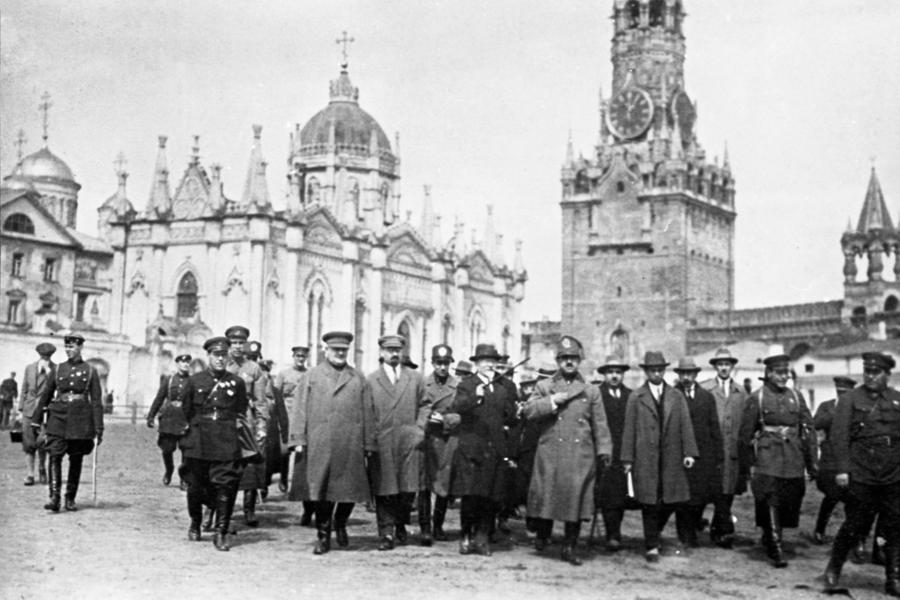 Официальный визит короля Афганистана Амануллы-хана в СССР по приглашению советского правительства. Аманулла-хан (на первом плане в центре) в Кремле. Слева от него — председатель ЦИК СССР Михаил Калинин (в черном пальто), второй слева от Калинина — председатель Совета народных комиссаров СССР Алексей Рыков