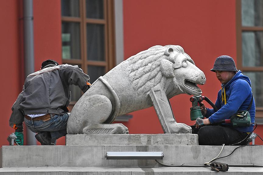 Рабочие чистят скульптуру каменного льва на ограде у Музея современной истории России