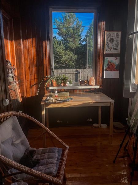 При этом сам дом деревяный, двухэтажный. Он не очень большой. На двоих — как раз. В нем есть пространство и для жизни, и для работы и творчества.