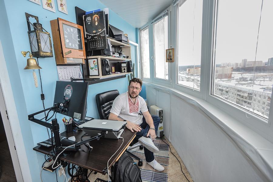 «У меня тут книги, компьютер и потрясающий панорамный вид на город. Видно даже "Москву-Сити", — ведет дальше по квартире Артем. — Уже есть идея, как украсить балкон-кабинет. Мы недавно были в музее “Слово” на ВДНХ, и мне запомнилась стилизованная религиозная роспись. Похоже на интерьер в фильме “Иван Васильевич меняет профессию”. Попробуем и эту задумку воплотить».