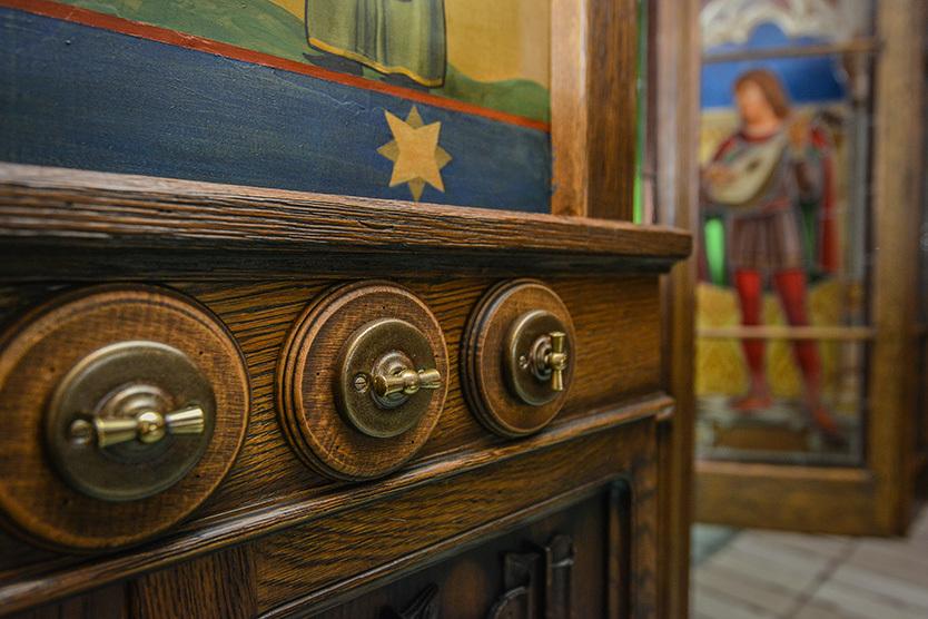 Под потолком — круглая люстра XVIII века. Это реплика на IV-III век, когда при королях Мелунгах королю одевали корону, а он ее отдавал в церковь, заявляя таким образом, что вся власть принадлежит Богу. И эти короны вешали в церквях на цепи. В XVIII веке стало модно делать потолочные светильники в виде короны. Конечно, все они были свечными, но я свою переоборудовал, поставил лампочки в виде свечей.