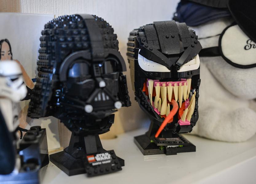 На полках гостевой у Таи можно найти Эмпайр-стейт-билдинг, Гарри Поттера, старинный автомобиль, композицию по мотивам «Звездных войн» и Статую Свободы. Даже цветы в этой комнате — из разноцветных кубиков.