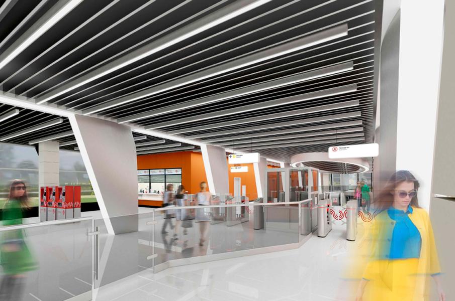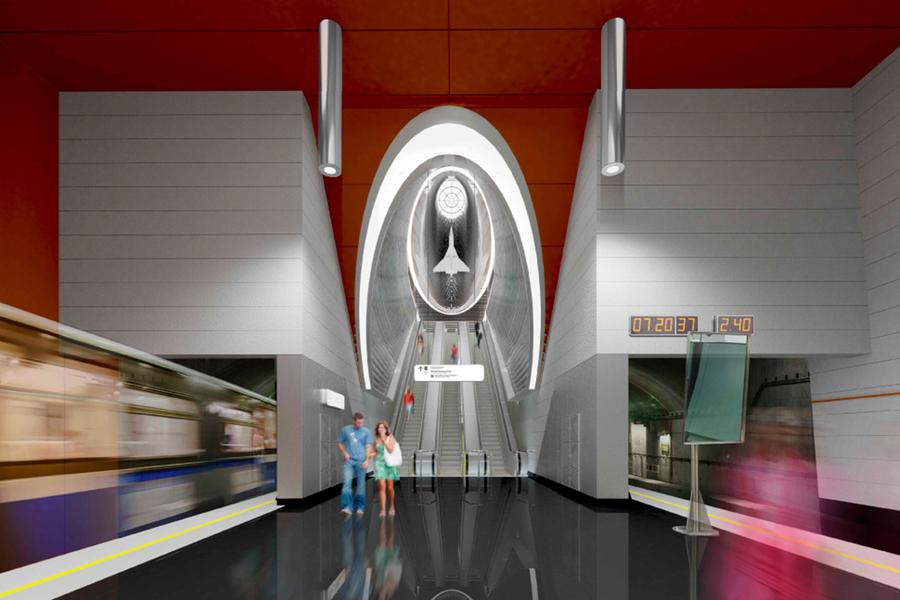 Известно также, что над наклонным ходом эскалатора появится световой колодец в виде воронки из алюминиевых панелей с висящей внутри моделью самолета Ту-144. На потолке платформенного участка уже ведется монтаж световых конструкций, напоминающих турбины самолетов.
