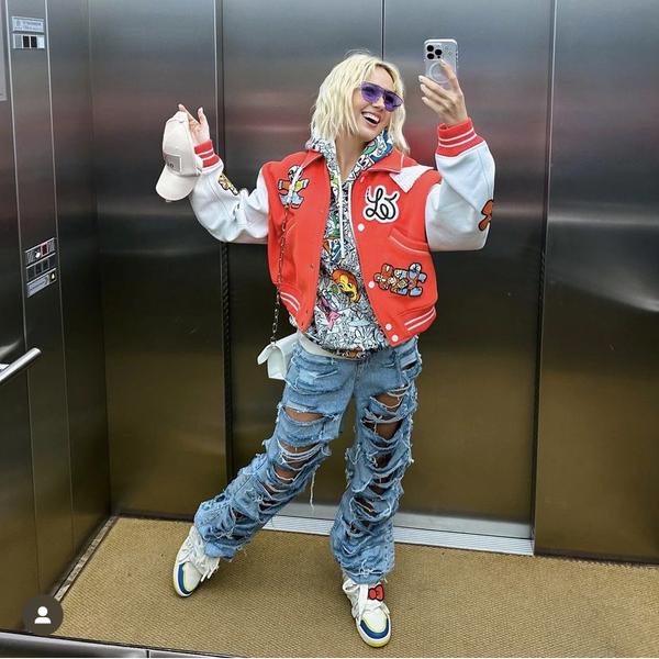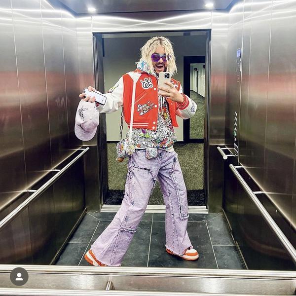 Звезда Black Star поделилась своей фотографией и фотографией Киркорова в одинаковых образах: красном спортивном бомбере, свободных джинсах и кедах. У обоих артистов на снимках белые волосы и сине-фиолетовые солнцезащитные очки. Два селфи были сделаны в зеркале в лифтах.