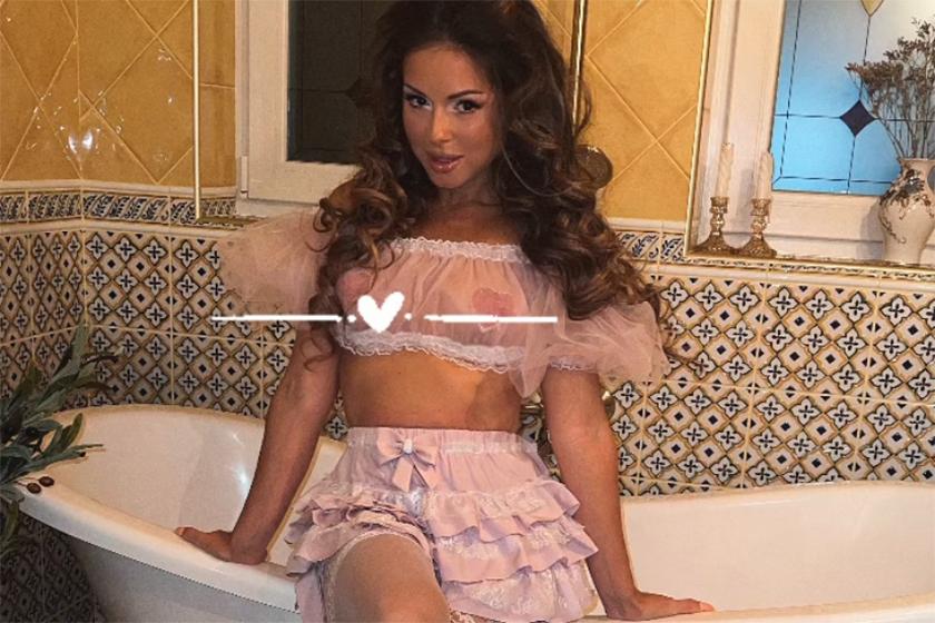 На фото Нюша позирует, сидя на краю ванны, в прозрачном топе, короткой розовой юбке, чулках и белых балетках с квадратным мысом. Волосы певица уложила крупной волной, а в макияже сделала акцент на глаза с помощью стрелок и белых теней.