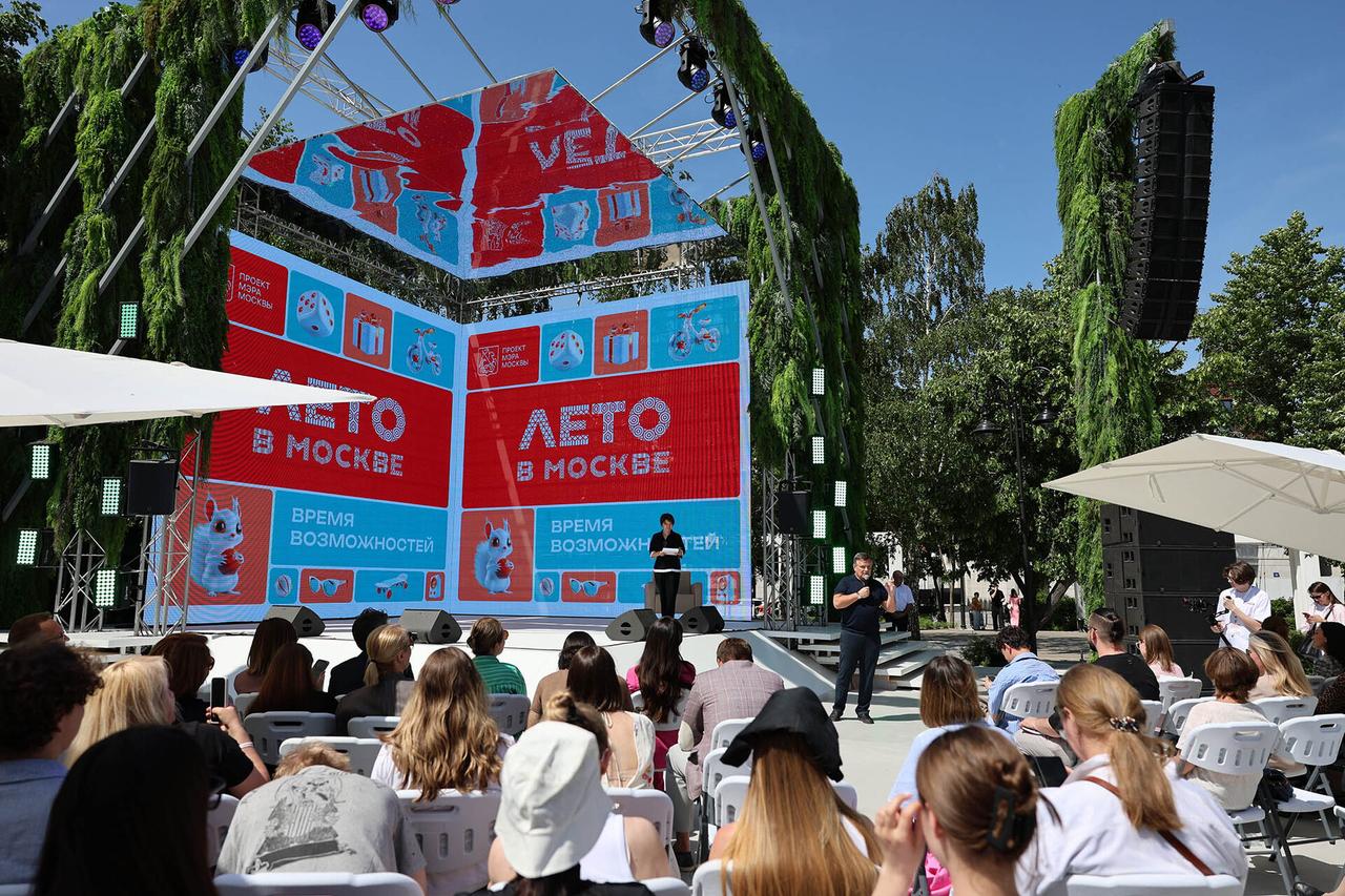 В Репинском сквере на Болотной площади, где проходила презентация одного из самых масштабных городских проектов «Лето в Москве», яблоку было негде упасть. Под зажигательную музыку на большом экране менялись красочные слайды, а на сцене — спикеры, которые знакомили аудиторию с грандиозными планами на этот сезон.